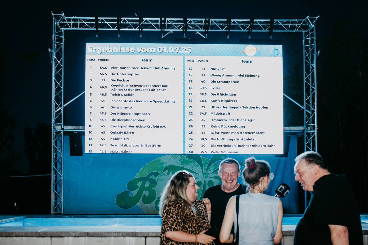 Unser beliebtes Welle Niederrhein-Kneipenquiz war in Uerdingen zu Gast! Und es war fantastisch. Mit Sand unter den Füßen und richtig viel Sonne im Gesicht haben wir Eure Köpfe zum Rauchen gebracht im BeachClub Krefeld. Das war ein toller Quizabend mit Euch! Und hier sind Eure Ergebnisse: