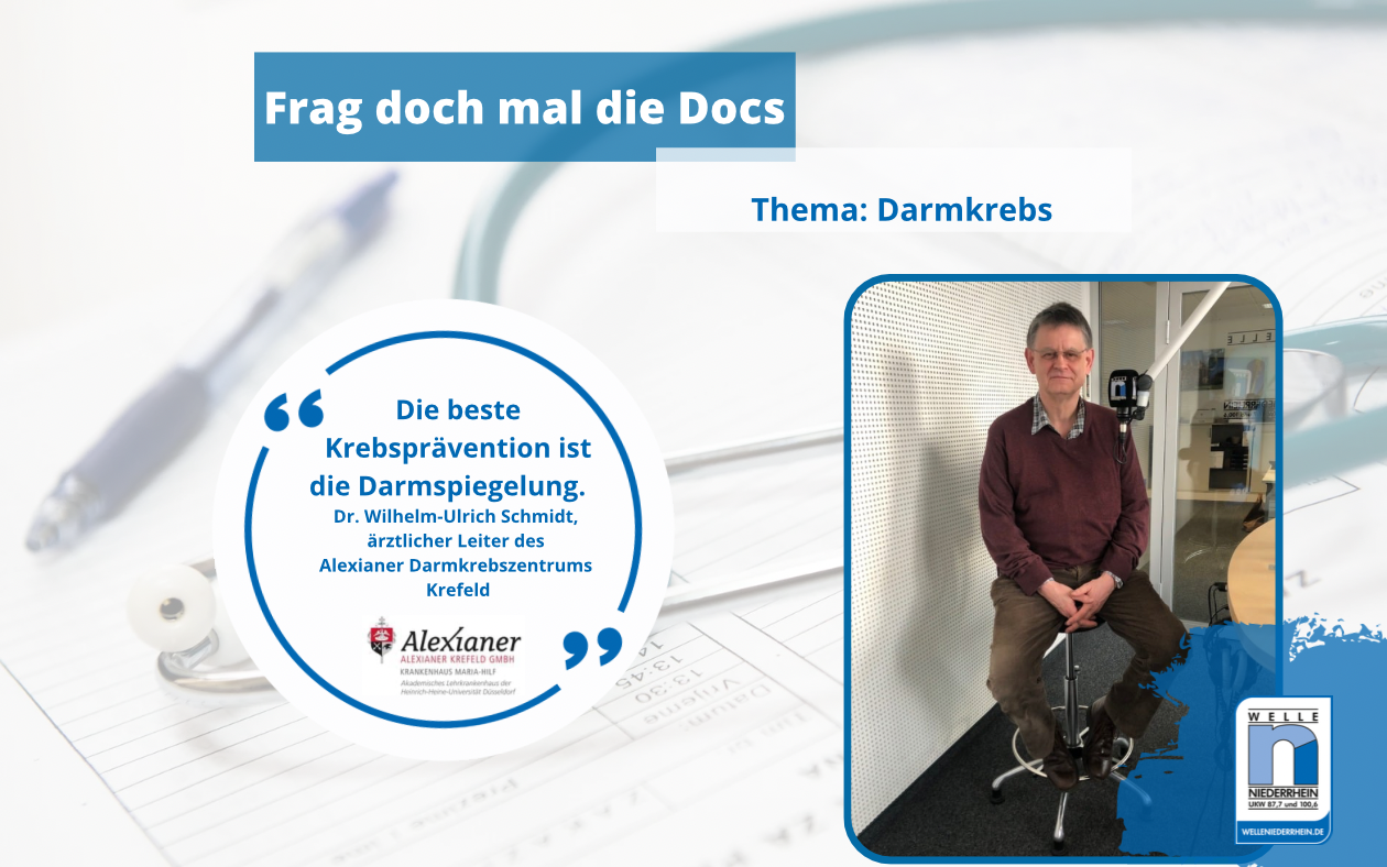 In der aktuellen Folge erfahrt ihr, warum ihr unbedingt zur Darmkrebsvorsorge gehen solltet. Außerdem sprechen wir auch über Alarmsignale und die Heilungschancen. Das alles in der aktuellen Folge "Frag doch mal die Docs" mit Sabrina Kehren und den Expertinnen und Experten des Alexianer Krankenhauses Maria Hilf in Krefeld.