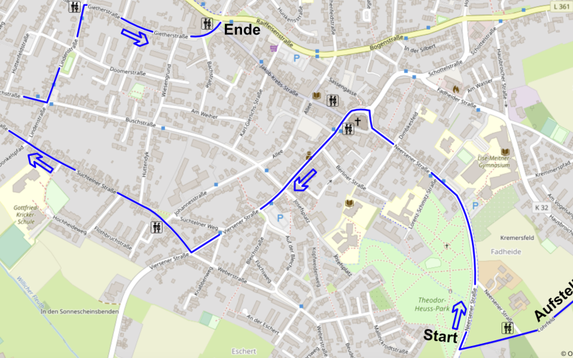 Aufstellung: Hindenburgstraße ab Josef-Steinbüchel-Straße stadteinwärts, Thomasweg ab Tankstelle bis Heidweg.