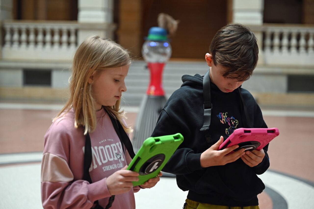 Linus (r) und Matilda stehen mit Tablets vor einem Roboter im Museum für Kommunikation Berlin.